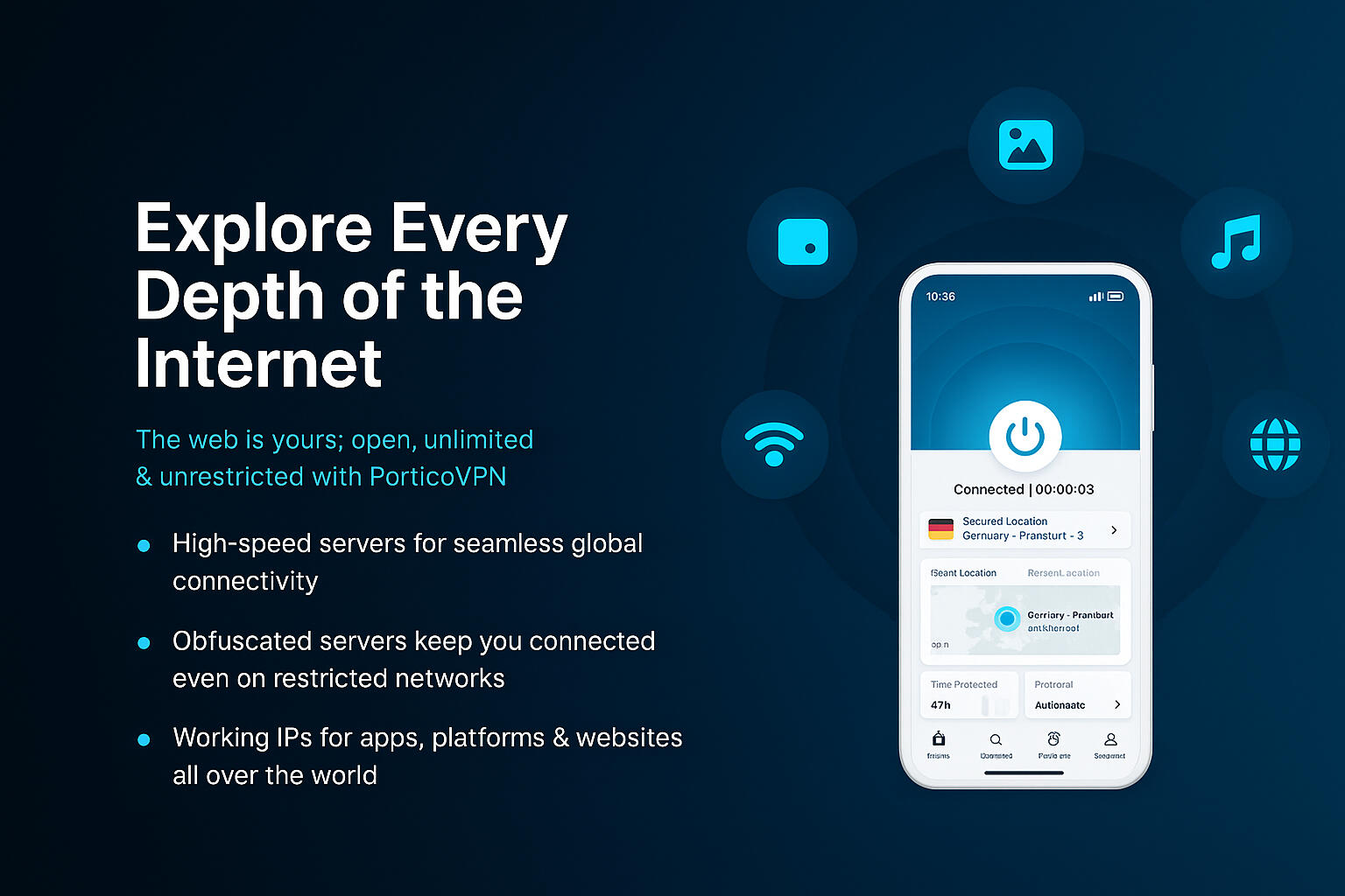 We encrypt your traffic with modern standards (AES-256-GCM, PFS), shielding your activity from ISPs and open networks. Connect with confidence—at home, on the go, in cafés.